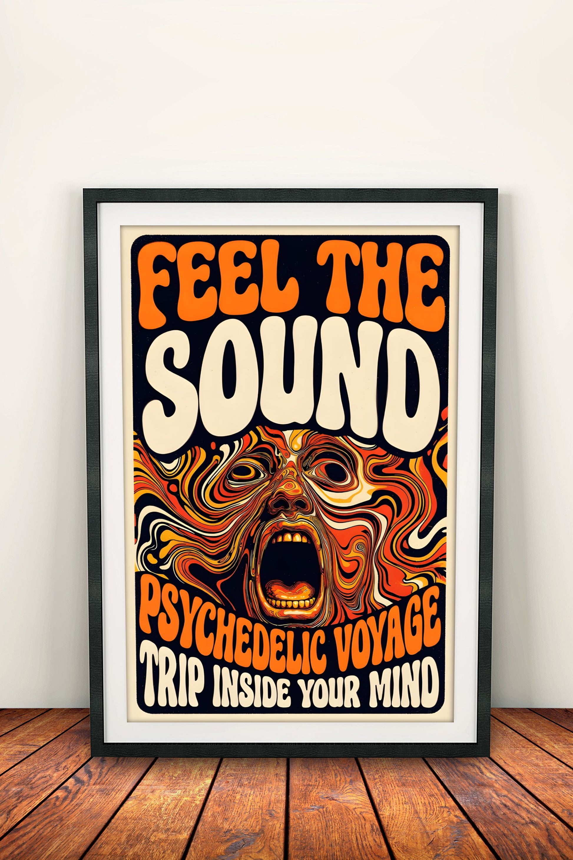 Vahva 60-70-luvun retrojuliste intensiivisellä trippaavalla ilmeellä ja tekstillä "Feel the Sound – Voyage". Täydellinen musiikkihuoneeseen, olohuoneeseen tai makuuhuoneeseen luomaan unelmoivaa, värikästä tunnelmaa. Klassinen vintage-tyyli boheemilla fiiliksellä – sopii retrosisustuksen ystäville.