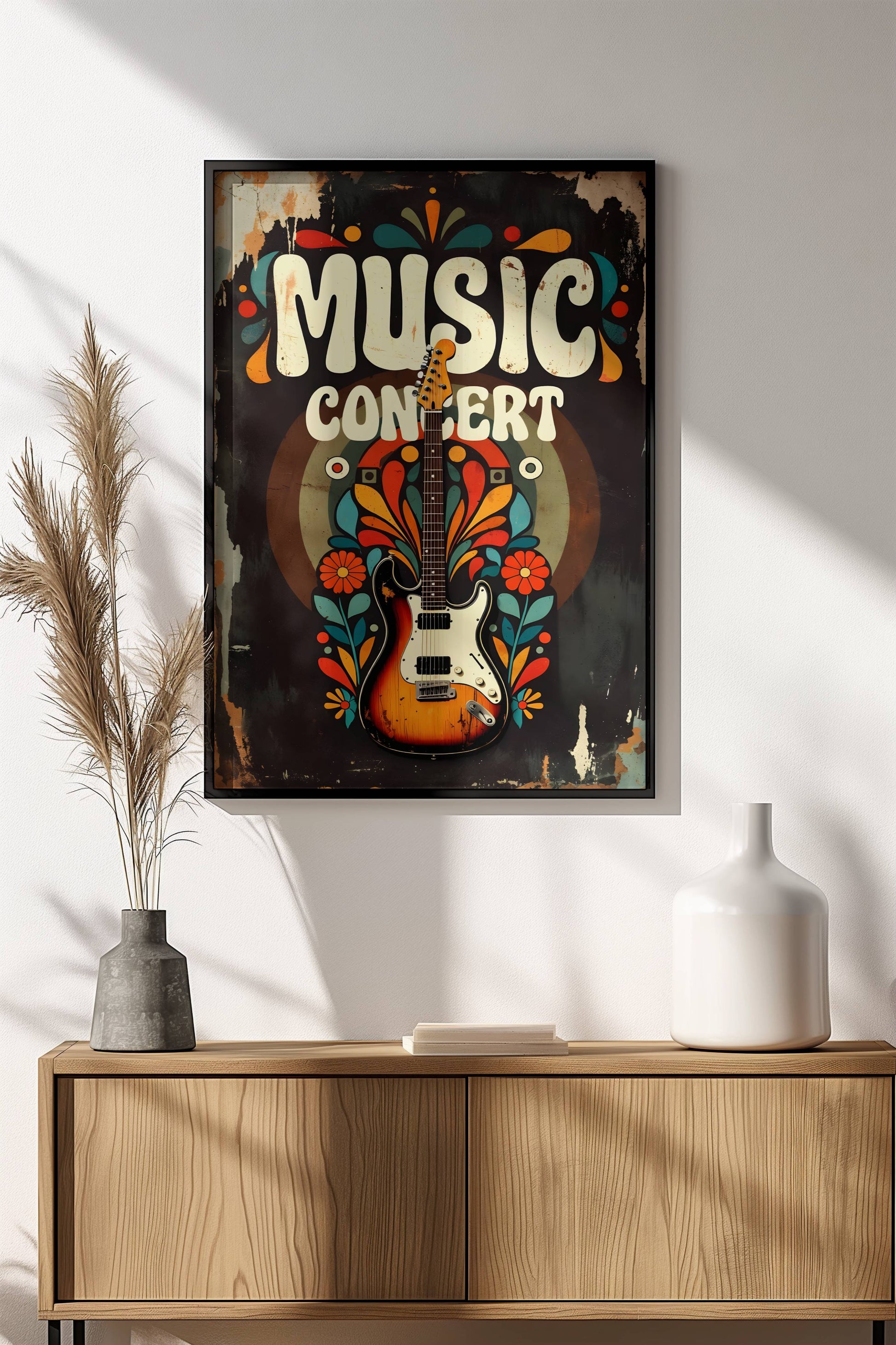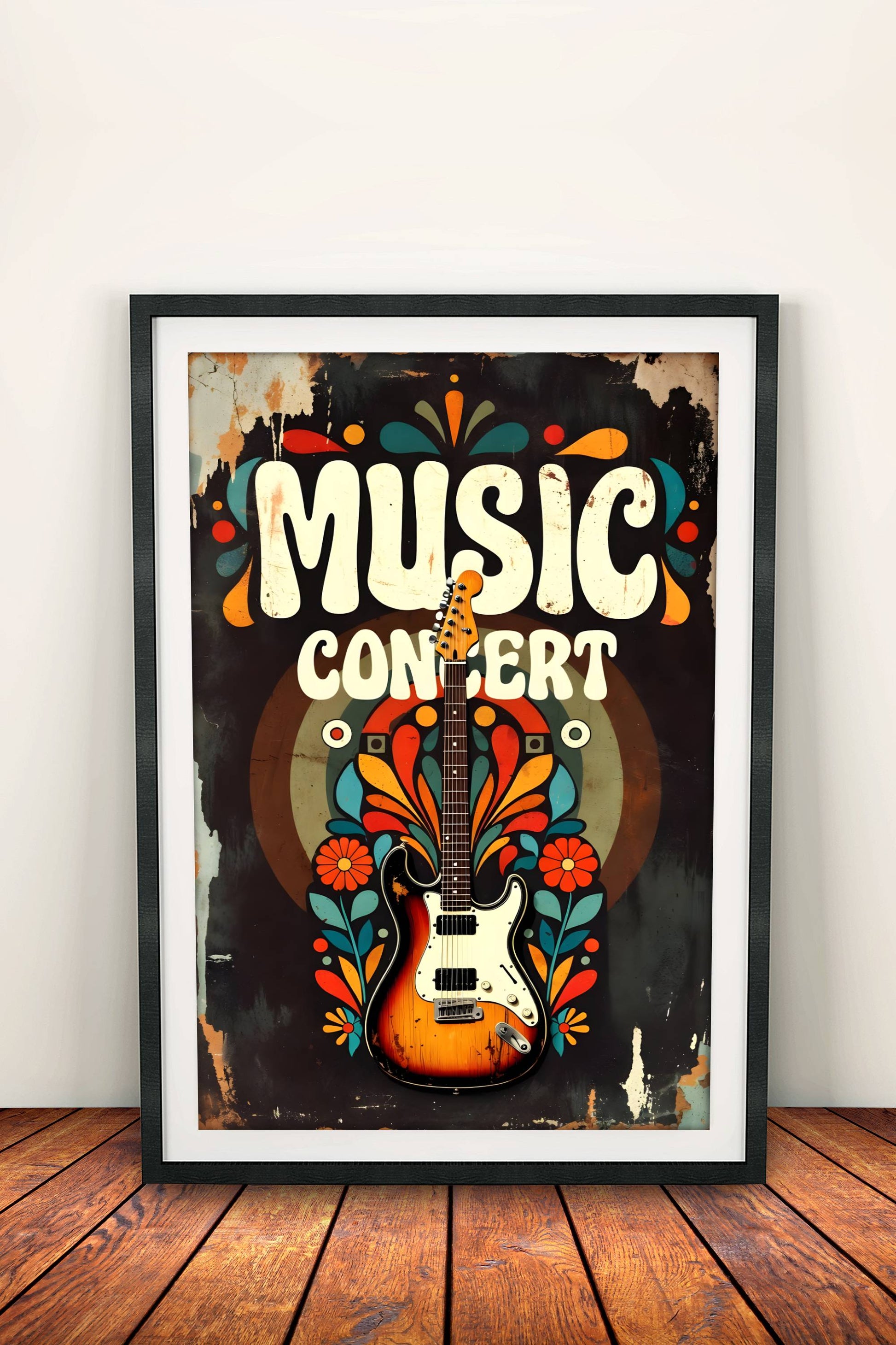 Energinen retro-tyylinen musiikkijuliste kuluneella paperi-ilmeellä: iso "MUSIC CONCERT" -teksti groovy fonteilla, sähkökitara keskellä värikkäine lehdin ja ympyröineen, taustalla oranssin, turkoosin ja keltaisen pyörteet – 70-luvun festarifiilis ja rock-henki.