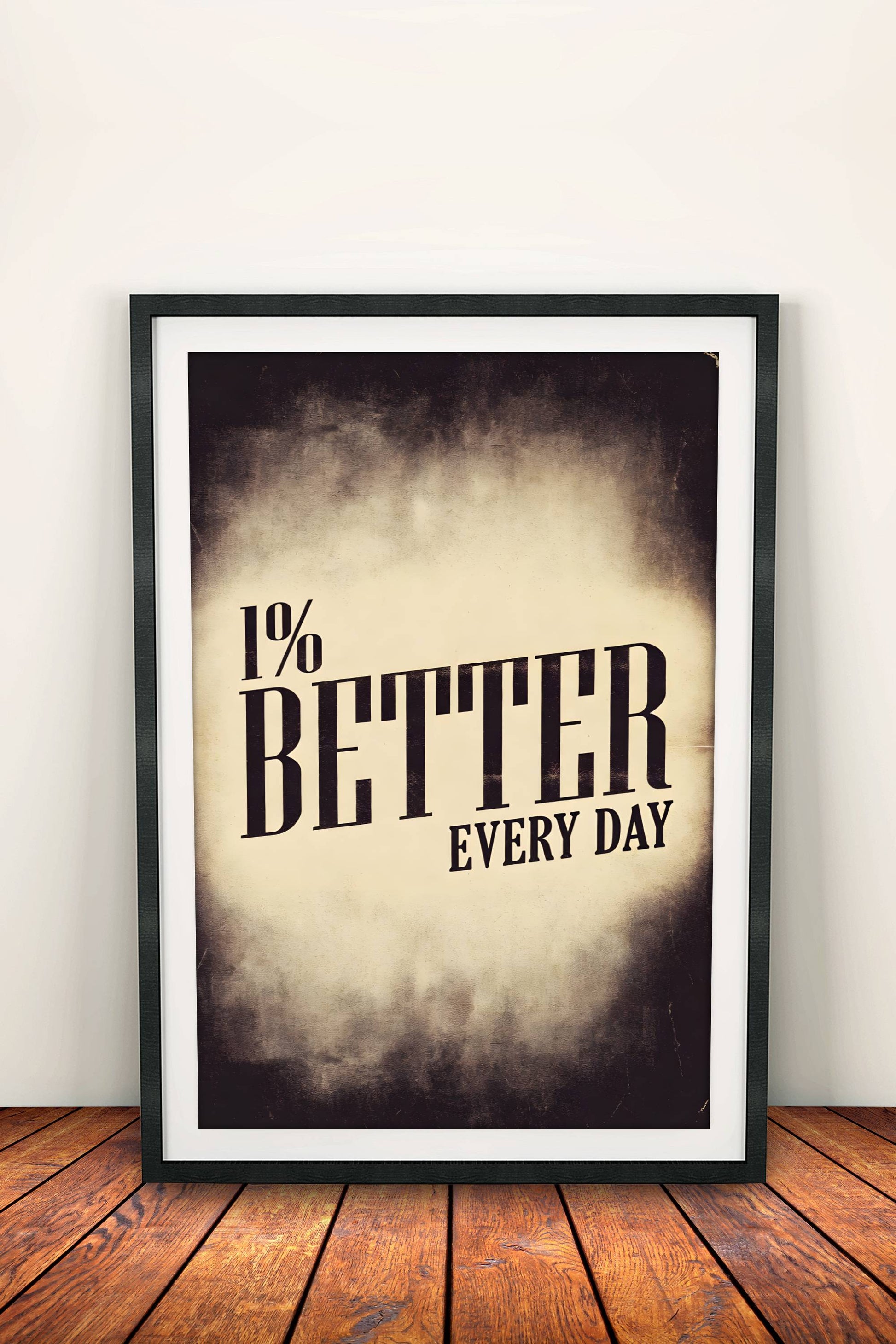 A powerful retro-style motivational poster on a dark worn background: large clear "1% BETTER EVERY DAY" text in a dramatic font, the slightly ragged vintage paper look adds depth and a sense of continuous improvement.