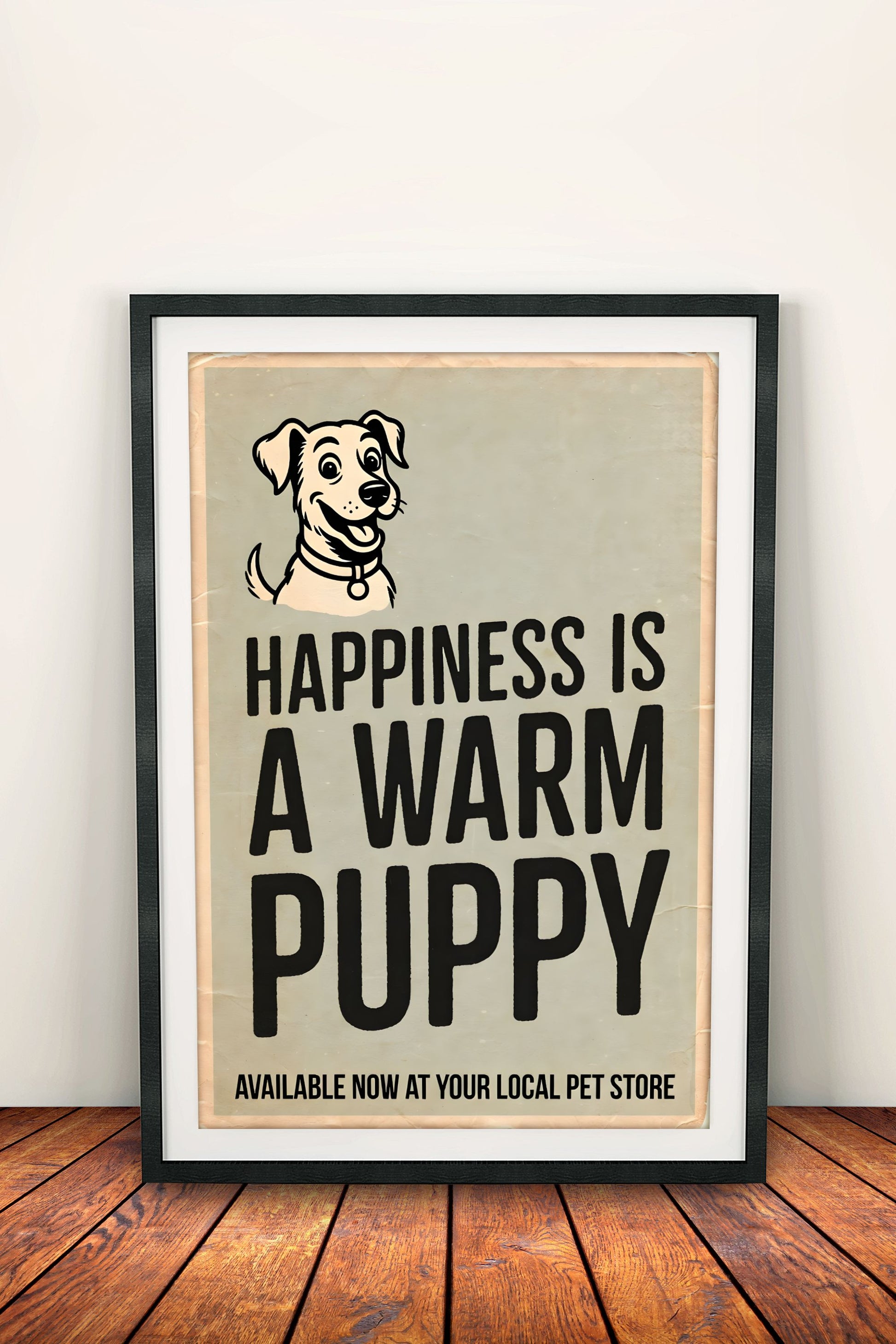 A cute retro vintage poster with a happy puppy and the text "Happiness Is a Warm Puppy". Aged patina and warm atmosphere - perfect for a nursery, living room, cottage or as a gift for a dog lover. Bring a smile and a nostalgic feeling to your home!