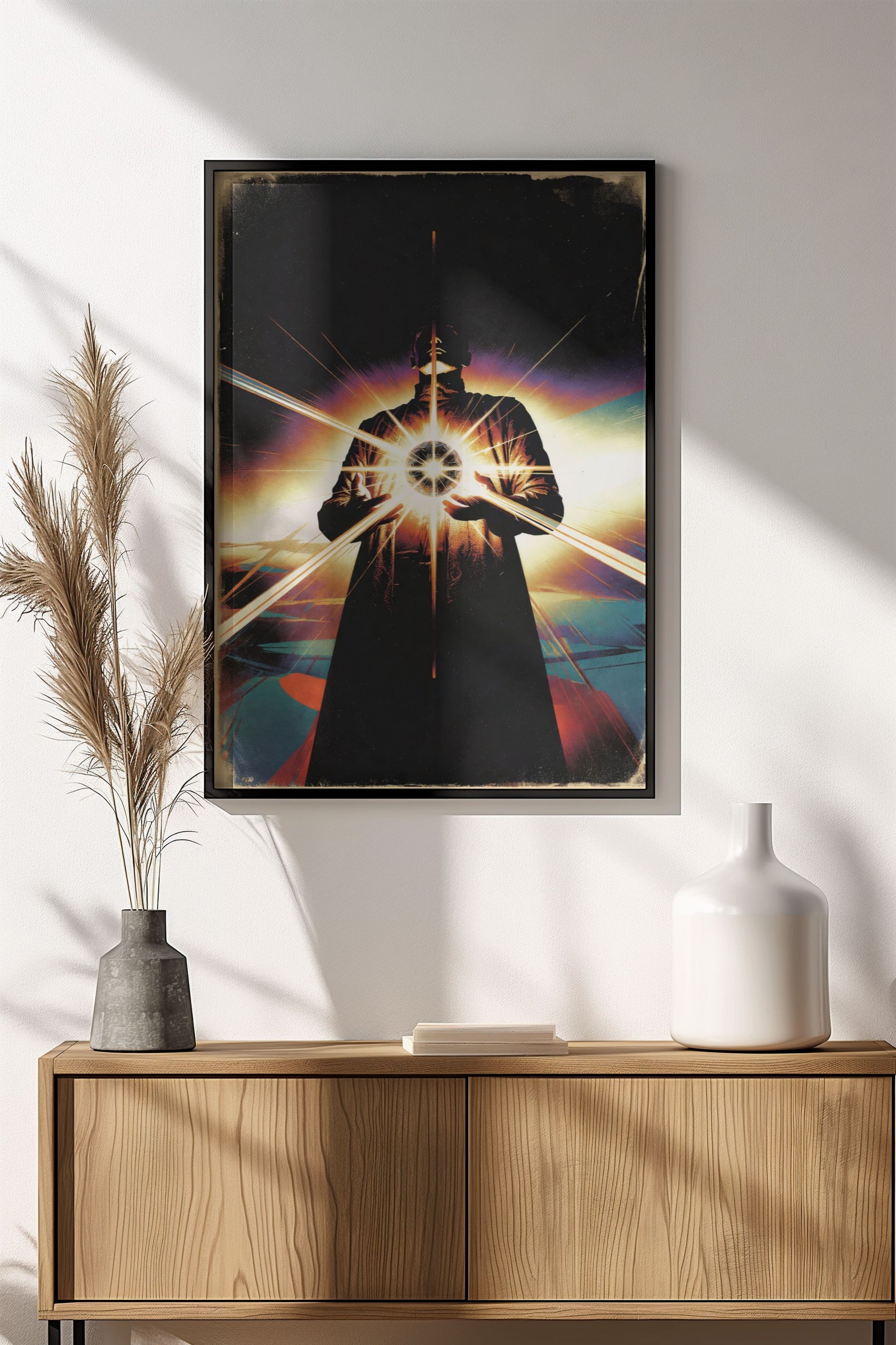 A powerful retro-style mystical poster on a dark background: a figure in long clothes holds a shining ball of light between his hands, bright rays and streams of light spread around - an intense and illuminated atmosphere with a worn vintage paper look.