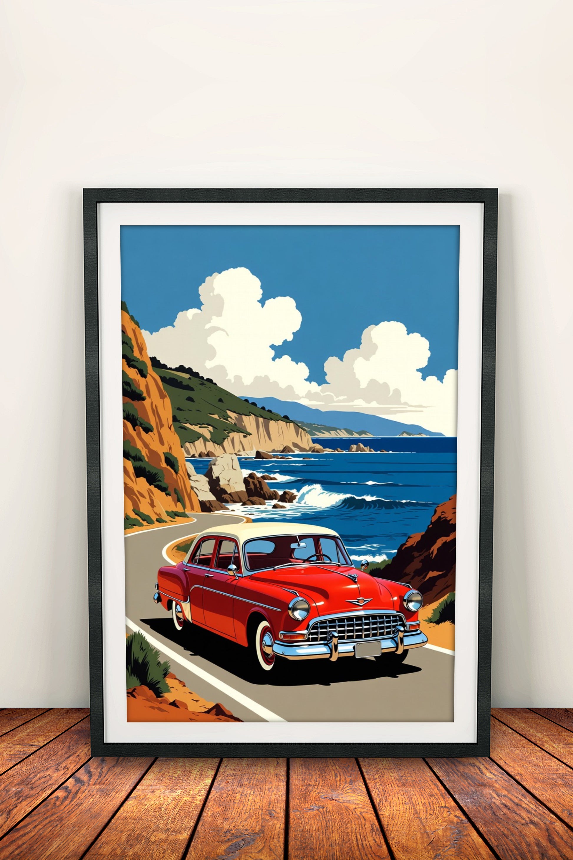 Brings a sense of freedom and road trip to your living room, garage or cottage – perfect for lovers of classic cars and seascapes.